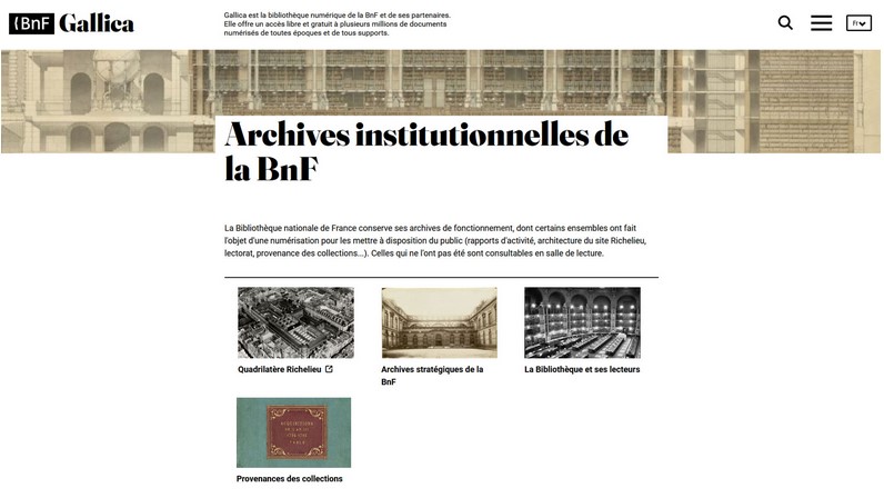 Gallica, la bibliothèque numérique de la Bibliothèque nationale de France, s’enrichit d’un parcours consacré aux archives de l’établissement. Sont désormais consultables en ligne des documents relatifs aux bâtiments du site historique de la BnF, mais aussi les documents stratégiques de l’établissement, ceux relatifs aux provenances des œuvres et aux publics de la bibliothèque. |