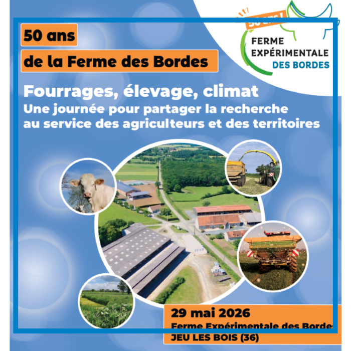 A l'occasion de ses 50 ans, la ferme expérimentale des Bordes (36) vous invite les 29 et 30 mai 2026 à deux journées portes ouvertes dédiées au partage des résultats de la recherche au service des agriculteurs et des territoires : - Une journée professionnelle thème "fourrages, élevage & climat" avec conférences et démonstrations - Une journée grand public avec animations, visites, ateliers pédagogiques