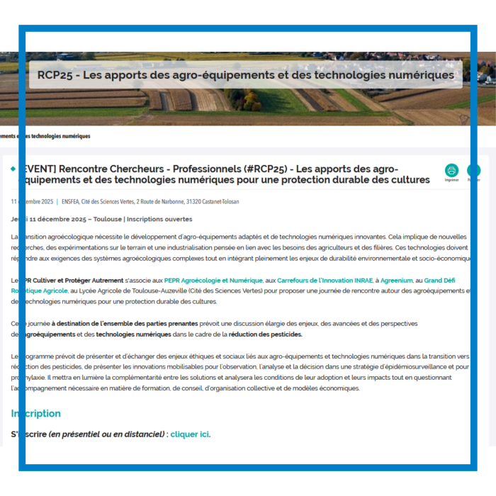 Le PPR Cultiver et Protéger Autrement s'associe aux PEPR Agroécologie et Numérique, aux Carrefours de l’Innovation INRAE, à Agreenium, au Grand Défi Robotique Agricole, au Lycée Agricole de Toulouse-Auzeville (Cité des Sciences Vertes) pour proposer une journée de rencontre autour des agroéquipements et des technologies numériques pour une protection durable des cultures. Pour s'inscrire