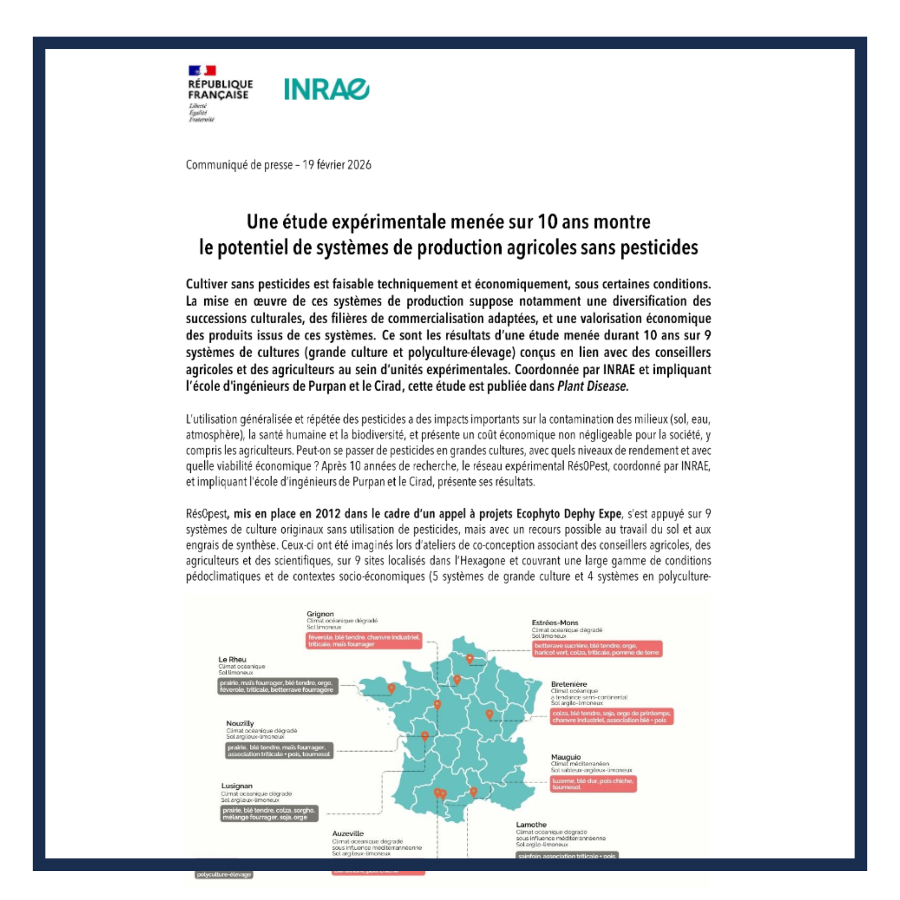 Retrouvez le communiqué de presse de l'INRAE qui présente une vue d'ensemble des dix années d'expérimentation du projet Rés0Pest, mené dans le cadre du réseau DEPHY EXPE.