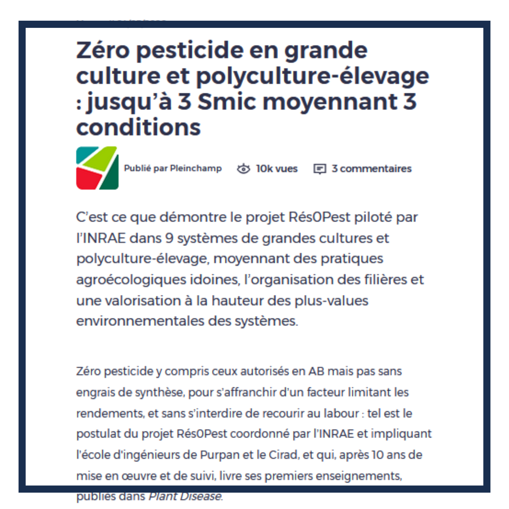 Dans son article, Pleinchamp revient sur les résultats du projet Rés0Pest, montrant qu’un système « zéro pesticide » en grande culture et polyculture‑élevage peut être rentable, en combinant plusieurs stratégies de leviers alternatifs. |