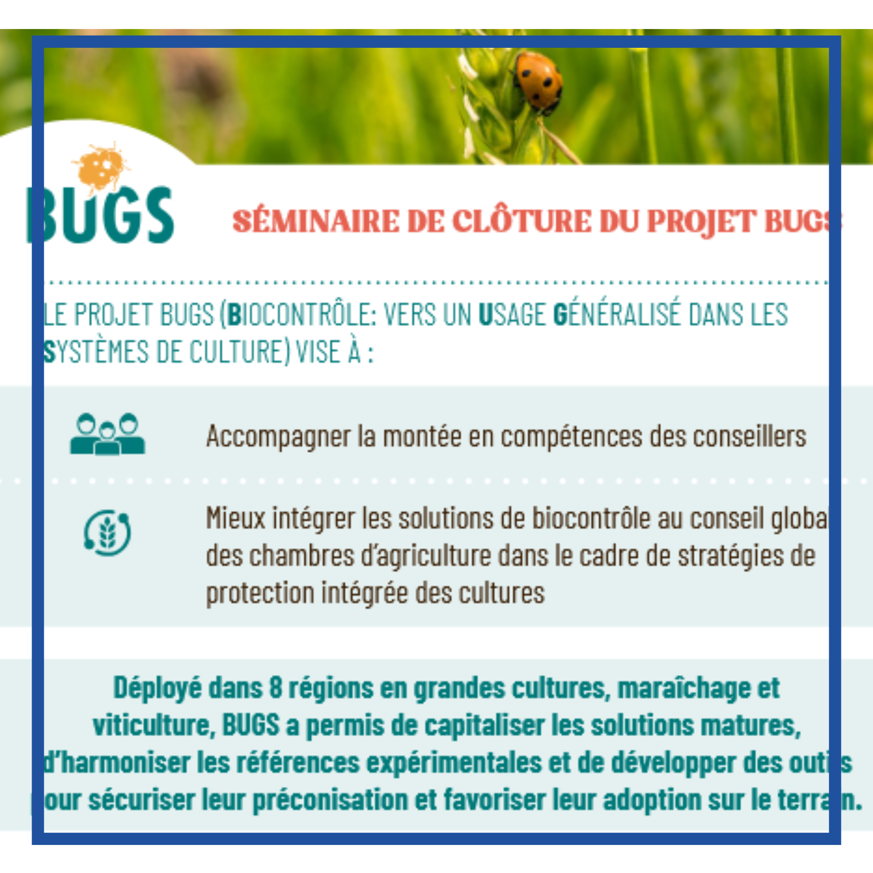 L'équipe du projet BUGS (Biocontrôle : vers un Usage Généralisé dans les Systèmes de culture) vous invite à son séminaire de fin de projet pour vous faire profiter de ses productions. Au programme de ce séminaire destiné aux conseillers : interventions d'experts, ateliers et présentation de nombreux livrables.