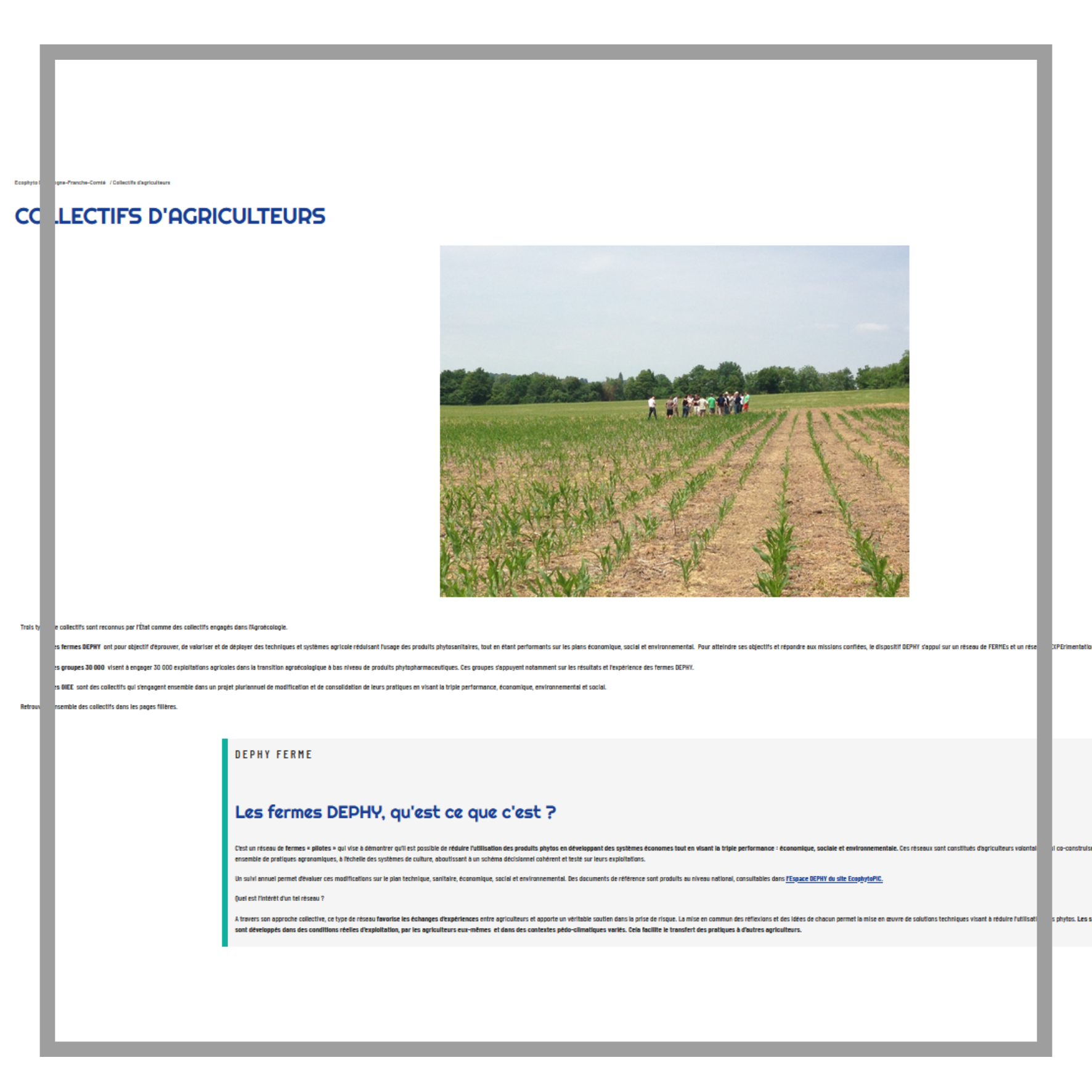 La page Ecophyto BFC présente les fermes DEPHY, les groupes 30 000 et les GIEE, et résume leurs objectifs ainsi que les principaux leviers techniques mobilisés pour réduire l’usage des produits phytosanitaires.