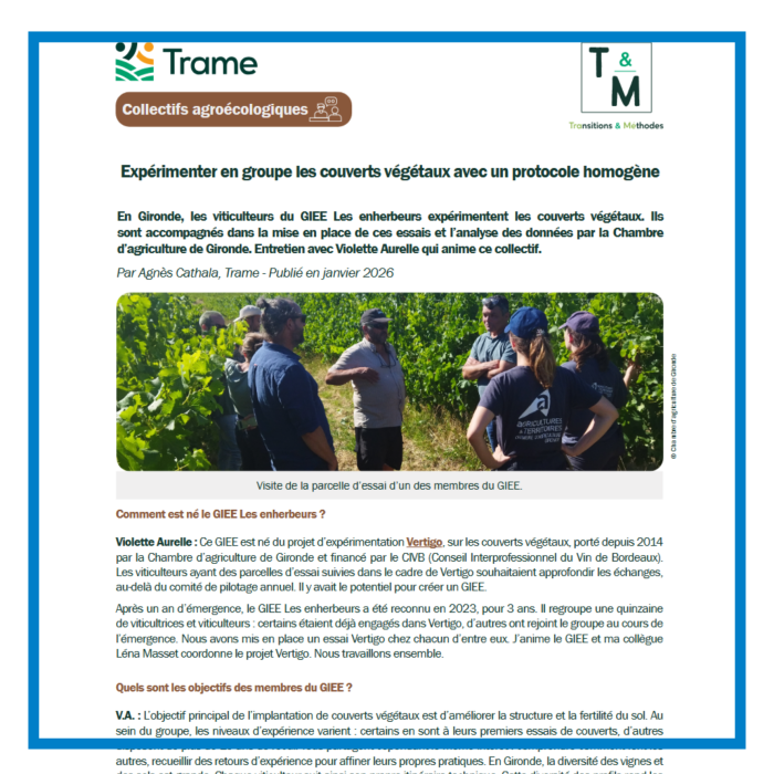 Trame propose une nouvelle ressource autour de l’expérimentation collective, illustrée ici par le travail mené en Gironde sur les couverts végétaux. On y retrouve notamment Violette Aurelle, animatrice du collectif "Les enherbeurs", qui accompagne les viticulteurs dans la mise en place d’un protocole commun et dans l’analyse des essais.