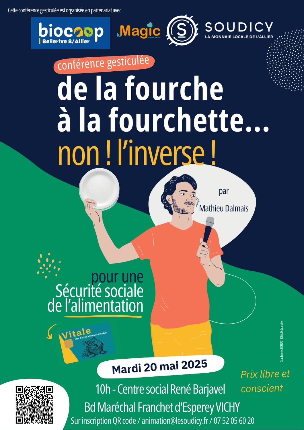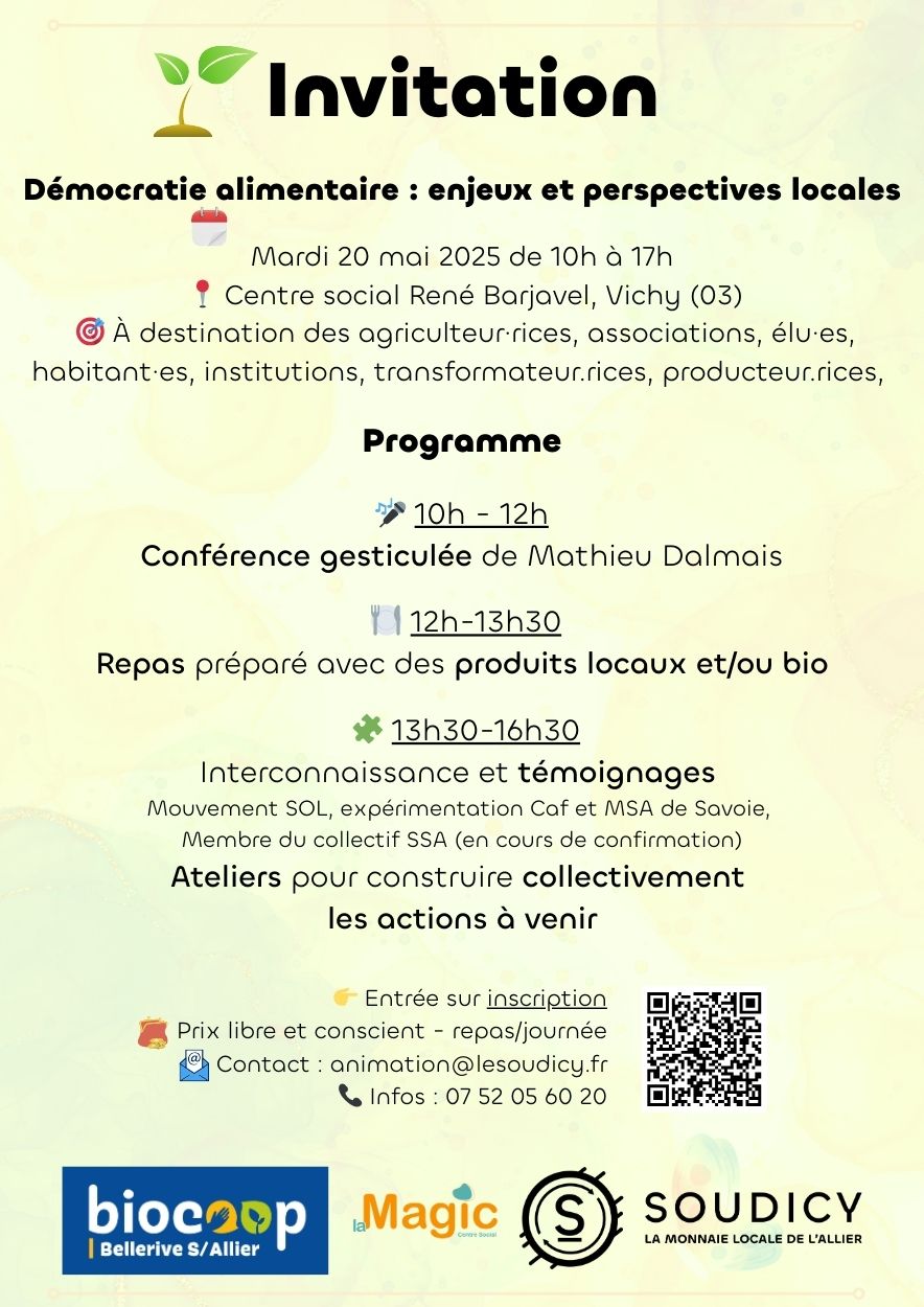 Depuis plusieurs mois, des collectifs et habitant·es du territoire se réunissent pour réfléchir aux enjeux de souveraineté alimentaire. Le mardi 20 mai, nous - Biocoop, La Magic et le Soudicy - vous invitons à une journée de sensibilisation, d’échanges et de mise en lien, pour : * Comprendre les grands enjeux de la démocratie alimentaire