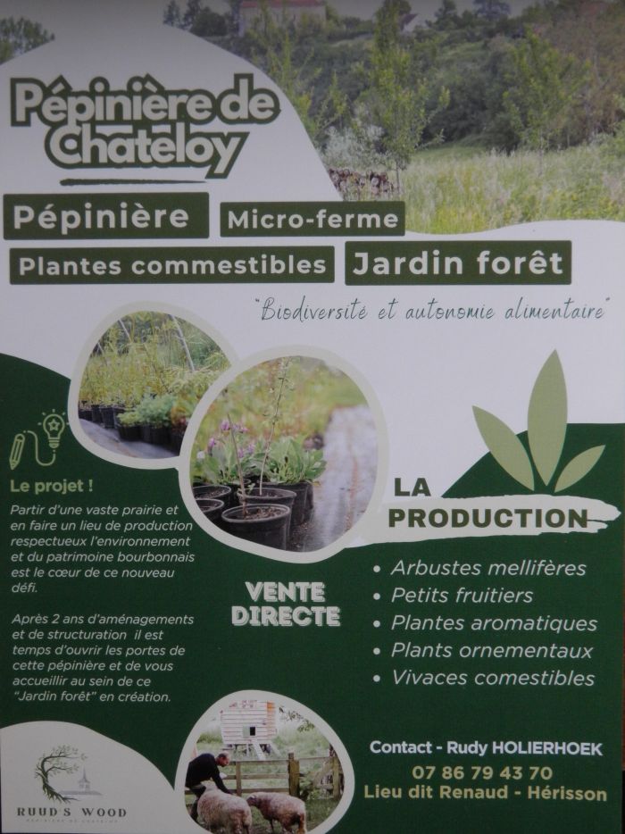 Et hop, un pépiniériste qui rejoint le Soudicy : Bienvenue à Rudy, de la pépinière de Chateloy à Hérisson !!! Plantes comestibles, jardin forêt... un bel endroit et de beaux plants sans traitements que l'on peut retrouver notamment sur le marché de Hérisson. Plus d'infos ? Cliquez directement sur la photo. |