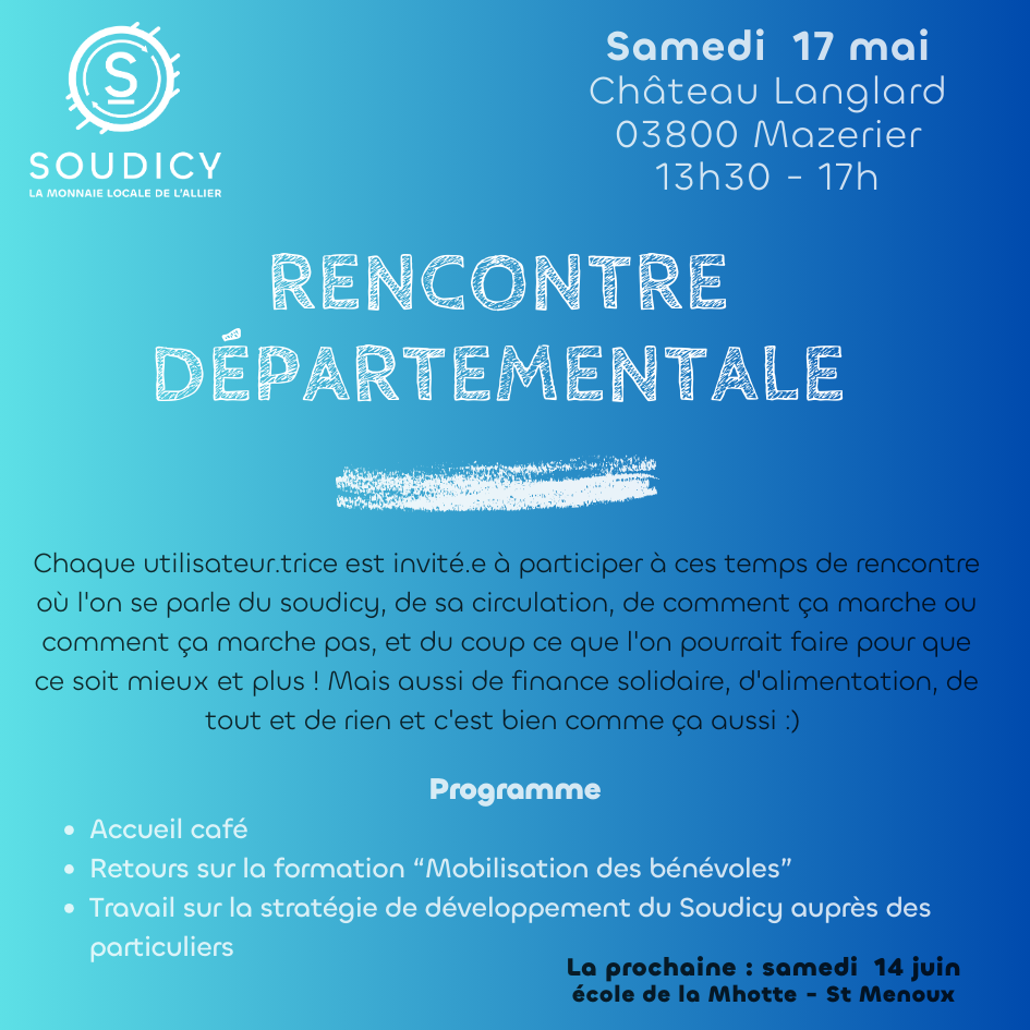 La prochaine est le mercredi 14 mai à 17h30 à Très- Allier - St Pourçain