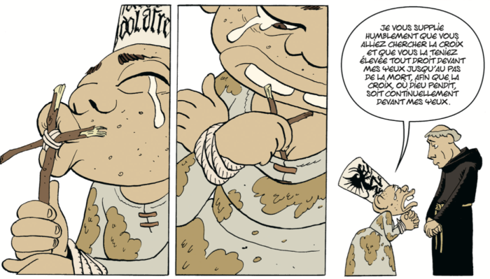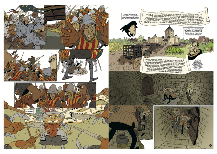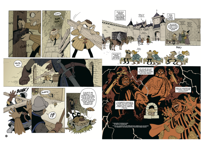 Le dessin précis de Benoît Springer, à mi-chemin entre réalisme et caricature, fait redescendre Jeanne d’Arc du piédestal où les idéologues l’avaient placée et dont elle est prisonnière depuis des siècles. La réalité historique est souvent plus terre à terre que la légende. Les mythes ont la vie dure, et c’est presque un sacrilège d’entreprendre de les remettre en question. Cet ouvrage ne rendra pas Jeanne d’Arc plus héroïque qu’elle ne le fut réellement car elle n’a pas besoin de l’être pour mériter notre attention. Perdue dans l’immensité de l’Histoire, cette jeune fille eut un destin hors du commun, à la fois dérisoire et fascinant. Une vie éphémère broyée par les enjeux de son époque. Cela suffit pour qu’on prenne le temps de mieux la connaître. |
